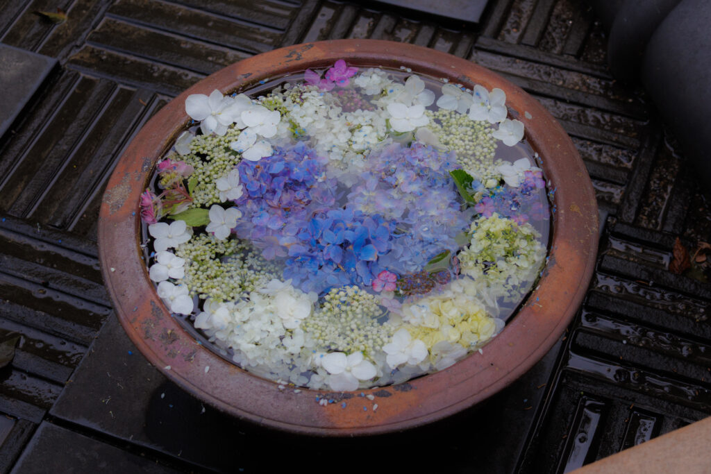 花手水があちこちに飾られていて、その一つひとつがとても丁寧に整えられていて……
